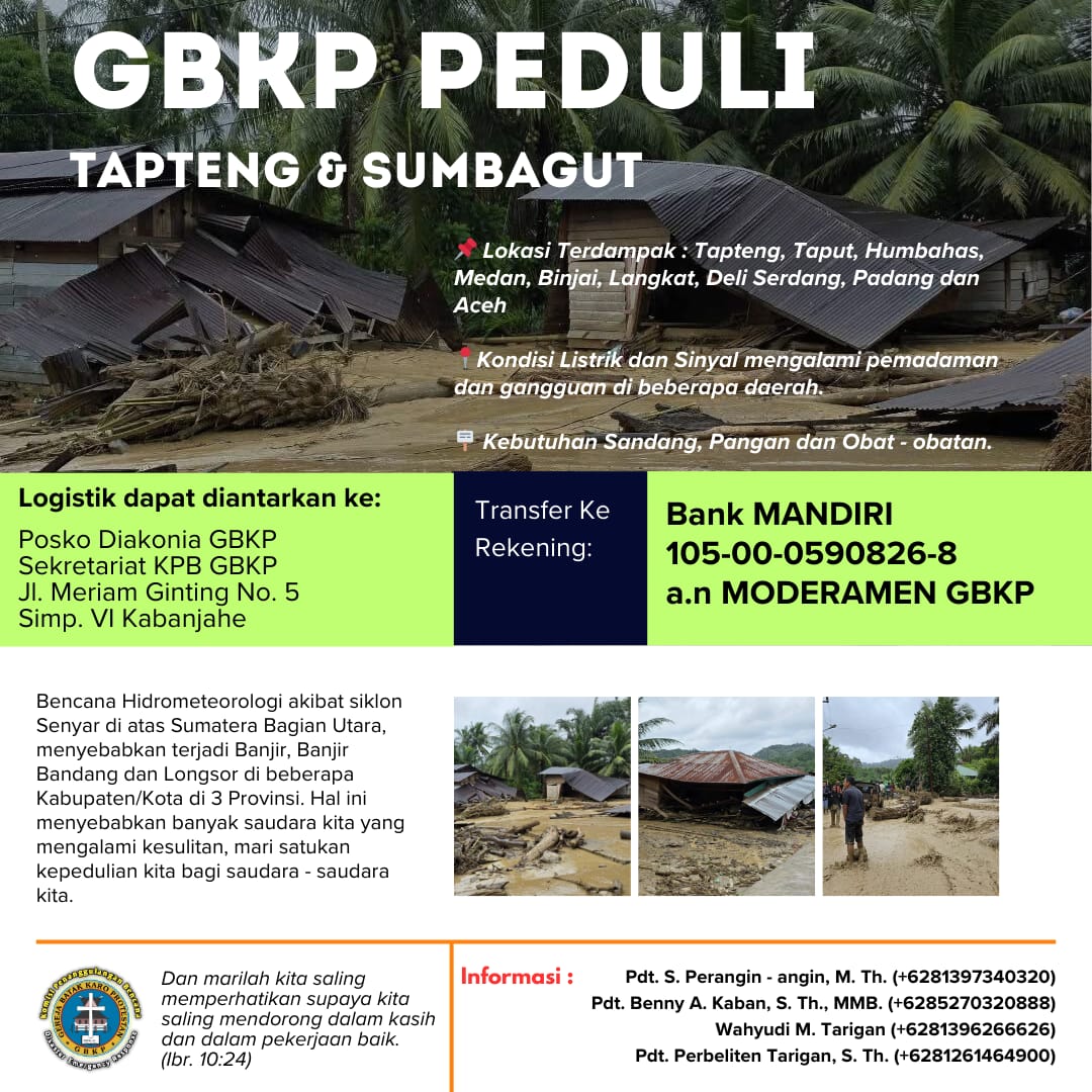 Ketua Umum Moderamen GBKP Pdt Krismas Barus didampingi Kabid Diakonia Pdt Seth Peranginangin mengajak semua jemaat untuk turut berpartisipasi dengan mengambil bagian sebagai bentuk kepedulian dan empati bagi masyarakat yang terdampak bencana alam. "Mari kita saling mendukung saudara-saudara kita untuk melalui masa – masa sulit yang dihadapi saudara kita. 'Bertolong-tolonganlah menanggung bebanmu! Demikianlah kamu memenuhi hukum Kristus. (Gal. 6:2)' ," ajak Pdt Seth.